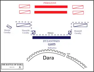 The size of Justinian's army is unclear. Bury, writing in the 1920s, accepted the estimate of 150,000 troops of all classes in 559 given by Agathia of Myrina in his History.[10] Modern scholars estimate the total strength of the imperial army under Justinian to be between 300,000 and 350,000 soldiers.[11] Field armies generally had 15,000 to 25,000 soldiers and were formed mainly of comitatenses and foederati, reinforced by the commanders' retinues and barbarian allies. The expeditionary force of Belisarius during his reconquest of Carthage from the Vandals in 533 is illustrative.