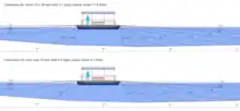 As the frictional drag of a displacement hull decreases with about the third power of the speed, even the smallest amount of power can effect movement with enough leverage or if suitably geared down. The majority of the world's cable ferries are indeed manually propelled either with a crank turning a chain wheel or by pulling directly on a cable. For example the Saugatuck Chain Ferry taking up to 24 passengers is cranked by a single person at about 0.3 m/s. The former cable ferry at Malgas in South Africa even carried several cars, pulled by a couple of men at a slow walking speed. Ferries of this size that were hand-operated, such as the Reedham Ferry, have since been motorised in order to reduce the level of hard work and increase the speed. For these and other ferries of up to 20 t or so displacement, typical installed motor power in kilowatts ranges from single figures to low double figures. For example, the 22 meter, 22 tonne Pritzerbe Ferry has 23 kW installed. This allows comparison with free ferries. The motor ferry "Luise" on the Wannsee near Berlin, of similar tonnage, size and construction, has 290 kW installed.[9]