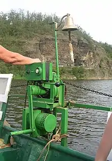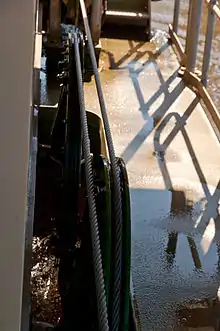 A very rare type are cable-ferries that are not propelled by themselves but rather are pulled from land side. An example of such a cable ferry was the Kungälv – Fästningsholmen ferry in Sweden.[2][3] Today, the Jonen ferry in the Netherlands is pulled by a winch on the banks. These cable ferries can be operated electrically without having to provide electricity by rechargeable batteries or an overhead wire. Saving the weight of the engine on board, these ferries can also be operated using less energy.