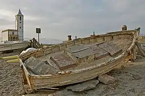 The strip of beach known as Playa de San Miguel and the adjacent road stretches from the small village of Cabo de Gata to La Fabriquilla before ascending a tiny mountain pass toward the Arrecife de las Sirenas and the beaches beyond. This coastal strip is generally known as Cabo de Gata although it comprises several little smaller villages (pueblitos) including Cabo de Gata, Almadraba de Monteleva, and La Fabriquila. At Almadraba de Monteleva are the salt works that are still operational, next to the salt works are the ram-shackled and salt-blasted houses of former workers, some of which are still occupied. Opposite these houses is the church of San Miguel. Behind the salt works are the lagoons known as Las Salinas de Cabo de Gata. Cabo de Gata has a tradition of fishing, which continues to this day, and there are several old fishing boats that have been left along the Playa de San Miguel as artefacts of days gone by. These are said to have an important ethnological value and are left as a "living museum".