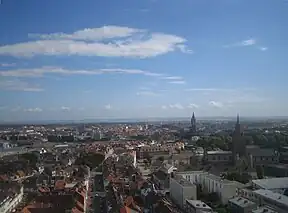 During the ensuing German occupation, it became the command post for German forces in the Pas-de-Calais/Flanders region and was very heavily fortified, as the Germans generally believed that the Allies would invade there.[48] It was also used as a launch site for V1 flying bombs and for much of the war, the Germans used the region as the site for railway guns to bombard the south-eastern corner of England. In 1943 they built massive bunkers along the coast in preparation for launching missiles on the southeast of England.[49] Despite heavy preparations for defence against an amphibious assault, the Allied invasion took place well to the west in Normandy on D-Day. Calais was very heavily bombed and shelled in a successful effort to disrupt German communications and persuade them that the Allies would target the Pas-de-Calais for invasion (rather than Normandy). The town, by then largely in ruins, was laid siege to and liberated by General Daniel Spry's 3rd Canadian Infantry Division between 25 September and 1 October 1944.[50] On 27 February 1945 Calais experienced its last bombing raid—this time by Royal Air Force bombers who mistook the town for Dunkirk, which was at that time still occupied by German forces.[51] After the war there was little rebuilding of the historic city and most buildings were modern ones.