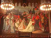 English wool trade interests and King Edward III's claims to be heir to the Kingdom of France led to the Battle of Crécy between England and France in 1346,[14] followed by Edward's siege and capture of Calais in 1347.[15] Angered, the English king demanded reprisals against the town's citizens for holding out for so long ("obstinate defense") and ordered that the town's population be killed en masse. He agreed, however, to spare them, on condition that six of the principal citizens would come to him, bareheaded and barefooted and with ropes around their necks, and give themselves up to death.[16] On their arrival he ordered their execution, but pardoned them when his queen, Philippa of Hainault, begged him to spare their lives.[17][18] This event is commemorated in The Burghers of Calais (Les Bourgeois de Calais), one of the most famous sculptures by Auguste Rodin, erected in the city in 1895.[19] Though sparing the lives of the delegation members, King Edward drove out most of the French inhabitants, and settled the town with English. The municipal charter of Calais, previously granted by the Countess of Artois, was reconfirmed by Edward that year (1347).[20]