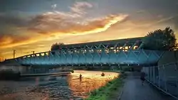 The cycle and pedestrian Abbey-Chesterton Bridge, with the railway bridge behind