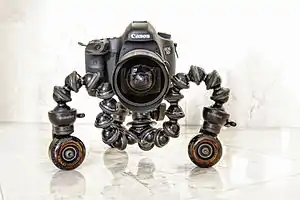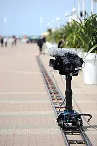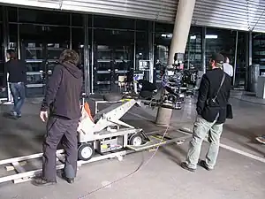 A camera dolly is a wheeled cart or similar device used in filmmaking and television production to create smooth horizontal camera movements. The camera is mounted to the dolly and the camera operator and focus puller or camera assistant usually ride on the dolly to push the dolly back and forth. The camera dolly is generally used to produce images which involve moving the camera toward or away from a subject while a take is being recorded, a technique known as a "dolly shot". The dolly grip is the dedicated technician trained to operate the dolly by manually pushing it back and forth.[1]