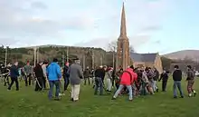 Teams are informal and unregulated, often numbering more than 50 people (both males and females) on the field – historic commentary cites matches played with anywhere between four and two hundred players.[15] In recent years, the match has been refereed by local radio presenter John Kaneen who revived the game in recent years. Playing equipment is supposed to consist of a bent stick, though there are many variations on the design. The game is a physically demanding contact sport, and protective equipment is advised.