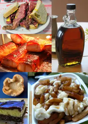 Canadian cuisine varies widely depending on the region. The former Canadian prime minister Joe Clark has been paraphrased to have noted: "Canada has a cuisine of cuisines. Not a stew pot, but a smorgasbord."[199] While there are considerable overlaps between Canadian food and the rest of the cuisine in North America, many unique dishes (or versions of certain dishes) are found and available only in the country. Common contenders for the Canadian national food include poutine[200][201][202] and butter tarts.[203][204] Other popular Canadian made foods include indigenous fried bread bannock, French tourtière, Kraft Dinner, ketchup chips, date squares, nanaimo bars, back bacon, the caesar cocktail and many many more.[205] The Canadian province of Quebec is the birthplace and world's largest producer of maple syrup,[206] The Montreal-style bagel and Montreal-style smoked meat are both food items originally developed by Jewish communities living in Quebec [207]