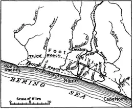 Cape Nome is a blunt, rocky headland on Seward Peninsula. The shore line between Cape Nome and Topkok is marked by large lagoons. West of Cape Nome, the shoreline, as far as Cape Rodney, is almost straight and uninterrupted except for the tidal inlets at the mouths of the larger rivers. Near the coast between Sinuk River and the flat-topped promontory of Cape Nome is a well-marked bench at an altitude of about 700 feet (210 m).[7] The shore line may formerly have extended from the hills west of Cripple River to Cape Nome, and probably formed a broad arc of fairly uniform curvature, like the present beach, but with smaller radius. The elevation of the depression between Cape Nome and Army Peak is 115 feet (35 m). Bed rock is traced northwestward from Cape Nome for a distance of nearly 5 miles (8.0 km), and in the low rounded hill between Hastings and Saunders creeks has an elevation of 297 feet (91 m). Between this point and the Army Peak schist mass, still farther to the northwest, is an interval of about 3 miles (4.8 km) across a broad, low saddle where no rocks are exposed. The Nome tundra gravels occupy the crescent-shaped lowland extending from Cape Nome to the hills west of Cripple River. The coastal plain or tundra gravel occupies the crescent-shaped area included between the sea and the hills and extending from Cape Nome to Rodney Creek, 14 miles (23 km) west of the mouth of Snake River.[5] Lagoons shut off from the sea by sand bars may be seen east of Cape Nome.[8]