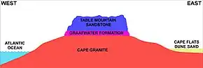 The sedimentary rocks of the Cape Supergroup, of which parts of the Graafwater and Peninsula Formations remain, were uplifted between 280 and 21S million years ago, and were largely eroded away during the Mesozoic. The region was geologically stable during the Tertiary, which has led to slow denudation of the durable sandstones. Erosion rate and drainage has been influenced by fault lines and fractures, leaving remnant steep-sided massifs like Table Mountain surrounded by flatter slopes of deposits of the eroded material overlaying the older rocks,[3]