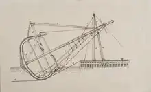 The vessel was then pulled over with tackles from the mastheads to strong-points on the shore. If this was being done on a beach, then the ship's guns might be moved to the shore and used as anchoring points.[4] However a careening wharf in a dockyard was preferred as it would have been equipped with the capstans and rope tackle necessary for hauling over the ship. The ship would have been lightened beforehand by removing all stores and a careening wharf would have had large sheds available to protect them from weather and theft.[4] With one side of the ship raised out of the water, maintenance work would be carried out. Then the ship would be floated off and the process repeated on the other side.[5]