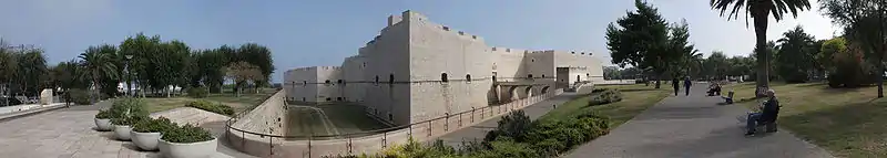 The castle of Barletta is the architectural result of various stratifications due to the succession of different ruling dynasties from the 11th century to the 18th century. Once a fortress for defensive purposes, surrounded by the sea that occupied the moat all around the castle and insulated it from potential enemy attacks, it constitutes a strategic point in city life as well as an important urban core.[1][2][3] It is home to the Municipal Library,[4] the Civic Museum and a conference and exhibition hall.[5]