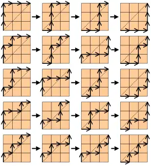 Figure 4. All monotonic paths in a 3×3 grid, illustrating the exceedance-decreasing algorithm.