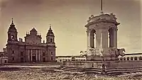 The Holy Church Cathedral Metropolitan Basilica of Santiago de Guatemala also Metropolitan Cathedral, officially Catedral Primada Metropolitana de Santiago, is the main church of Guatemala City and of the Archdiocese of Guatemala (Archidioecesis Guatimalensis).[1] It is located at the Parque Central in the center of the city. Its massive structure incorporates baroque and classical elements and has withstood numerous earthquakes. Damage by the devastating earthquakes of 1917 and 1976 has been repaired. The inside of the cathedral is relatively sparsely decorated but impresses by its size and its structural strength. The altars are ornate and decorative. In front of the cathedral stand a series of 12 pillars, solemnly remembering the names of thousands of people forcibly disappeared or murdered during the counterinsurgency violence of Guatemala's internal armed conflict, which began in 1960 and lasted until the final peace accord was signed in 1996.