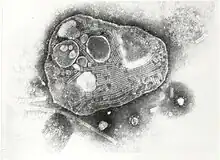 Rinderpest virus (RPV), a member of the genus Morbillivirus, is closely related to the measles and canine distemper viruses.[11] Like other members of the Paramyxoviridae family, it produces enveloped virions, and is a negative-sense single-stranded RNA virus. The virus is particularly fragile and is quickly inactivated by heat, desiccation and sunlight.[14]