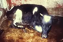 Rinderpest (also cattle plague or steppe murrain) was an infectious viral disease of cattle, domestic buffalo, and many other species of even-toed ungulates, including gaurs, buffaloes, large antelope, deer, giraffes, wildebeests, and warthogs.[2] The disease was characterized by fever, oral erosions, diarrhea, lymphoid necrosis, and high mortality. Death rates during outbreaks were usually extremely high, approaching 100% in immunologically naïve populations.[3] Rinderpest was mainly transmitted by direct contact and by drinking contaminated water, although it could also be transmitted by air.[4] After a global eradication campaign starting in the mid-20th century, the last confirmed case of rinderpest was diagnosed in 2001.[5]