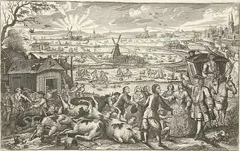 Cattle plagues recurred throughout history, often accompanying wars and military campaigns. They hit Europe especially hard in the 18th century, with three long panzootics, which although varying in intensity and duration from region to region, took place in the periods of 1709–1720, 1742–1760, and 1768–1786.[19] In the 18th century a deadly outbreak between 1769 and 1785 resulted in universal governmental action, but with somewhat divergent responses.[20] The Dutch and the German principalities demanded quarantines and strict burial practices; England and large parts of Italy (the Papal States) saw slaughter of infected animals; in the Austrian Netherlands (Flanders) the response was inspection and precautionary slaughter coupled with compensation to the owners. There was no code of practice and no standard response. But for a hundred years thereafter in German-speaking countries there was intense focus on the problem of Rinderpest.[21]
