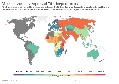 In October 2010, the FAO announced it was confident the disease has been eradicated.[6] The agency said that "[a]s of mid 2010, FAO is confident that the rinderpest virus has been eliminated from Europe, Asia, Middle East, Arabian Peninsula, and Africa," which were the locations where the virus had been last reported.[6] Eradication was confirmed by the World Organization for Animal Health on 25 May 2011.[7]