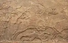 The photograph straight above shows Assyrian cavalry from reliefs of 865–860 BC. At this time, the men had no spurs, saddles, saddle cloths, or stirrups. Fighting from the back of a horse was much more difficult than mere riding. The cavalry acted in pairs; the reins of the mounted archer were controlled by his neighbour's hand. Even at this early time, cavalry used swords, shields, spears, and bows. The sculpture implies two types of cavalry, but this might be a simplification by the artist. Later images of Assyrian cavalry show saddle cloths as primitive saddles, allowing each archer to control his own horse.[10]