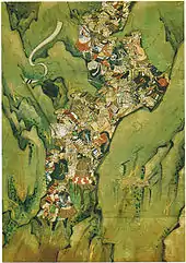 The Kambojas were famous for their horses, as well as cavalrymen (asva-yuddha-Kushalah).[53] On account of their supreme position in horse (Ashva) culture, they were also popularly known as Ashvakas, i.e. the "horsemen"[54] and their land was known as "Home of Horses".[55] They are the Assakenoi and Aspasioi of the Classical writings, and the Ashvakayanas and Ashvayanas in Pāṇini's Ashtadhyayi. The Assakenoi had faced Alexander with 30,000 infantry, 20,000 cavalry and 30 war elephants.[56] Scholars have identified the Assakenoi and Aspasioi clans of Kunar and Swat valleys as a section of the Kambojas.[57] These hardy tribes had offered stubborn resistance to Alexander (c. 326 BC) during latter's campaign of the Kabul, Kunar and Swat valleys and had even extracted the praise of the Alexander's historians. These highlanders, designated as "parvatiya Ayudhajivinah" in Pāṇini's Astadhyayi,[58] were rebellious, fiercely independent and freedom-loving cavalrymen who never easily yielded to any overlord.[59]