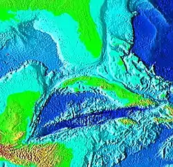 The Cayman Trough (also known as the Cayman Trench, Bartlett Deep and Bartlett Trough) is a complex transform fault zone pull-apart basin which contains a small spreading ridge, the Mid-Cayman Rise, on the floor of the western Caribbean Sea between Jamaica and the Cayman Islands.[1] It is the deepest point in the Caribbean Sea and forms part of the tectonic boundary between the North American Plate and the Caribbean Plate. It extends from the Windward Passage, going south of the Sierra Maestra of Cuba toward Guatemala. The transform fault continues onshore as the Polochic-Motagua fault system, which consists of the Polochic and Motagua faults.[2] This system continues on until the Chiapas massif where it is part of the diffuse triple junction of the North American, Caribbean and Cocos plates.[3]