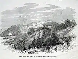 Shortly after the rebellion was suppressed, captured prisoners were put on trial, with many of them being executed. Others were exiled for life to the Andamans to prevent them from re-offending. Two hundred rebels were transported to the islands under the custody of the jailer David Barry and Major James Pattison Walker, an Indian Medical Service (IMS) doctor who had been warden of the prison at Agra. Another 733 from Karachi arrived in April, 1868.[4] In 1863, the Rev. Henry Fisher Corbyn, of the Bengal Ecclesiastical Establishment, was also sent out there and he set up the 'Andamanese Home' there, which was also a repressive institution albeit disguised as a charitable one.[5] Rev. Corbyn was posted in 1866 as Vicar to St. Luke's Church, Abbottabad, and later died there and is buried at the Old Christian Cemetery, Abbottabad. More prisoners arrived from India and Burma as the settlement grew.[6] Anyone who belonged to the Mughal royal family, or who had sent a petition to Bahadur Shah Zafar during the Rebellion was liable to be deported to the islands.