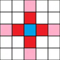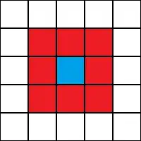 One way to simulate a two-dimensional cellular automaton is with an infinite sheet of graph paper along with a set of rules for the cells to follow. Each square is called a "cell" and each cell has two possible states, black and white. The neighborhood of a cell is the nearby, usually adjacent, cells. The two most common types of neighborhoods are the von Neumann neighborhood and the Moore neighborhood.[5] The former, named after the founding cellular automaton theorist, consists of the four orthogonally adjacent cells.[5] The latter includes the von Neumann neighborhood as well as the four diagonally adjacent cells.[5] For such a cell and its Moore neighborhood, there are 512 (= 29) possible patterns. For each of the 512 possible patterns, the rule table would state whether the center cell will be black or white on the next time interval. Conway's Game of Life is a popular version of this model. Another common neighborhood type is the extended von Neumann neighborhood, which includes the two closest cells in each orthogonal direction, for a total of eight.[5] The general equation for the total number of automata possible is kks, where k is the number of possible states for a cell, and s is the number of neighboring cells (including the cell to be calculated itself) used to determine the cell's next state.[6] Thus, in the two-dimensional system with a Moore neighborhood, the total number of automata possible would be 229, or 1.34×10154.