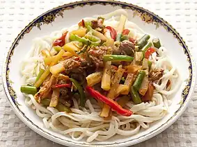 A meal typically begins with tea or fresh tandyr nan bread, followed by soup (shorpo) or pulled noodles (lagman). The main course is often a pilov dish with meat, rice and carrots; hundreds of variations of the basic pilov are possible with the addition of different herbs, dried fruits like raisins and apricots, nuts and other ingredients. After the main course a guest may be offered dumplings or grilled skewers of meat, and fresh fruit often takes the place of a final dessert course.[2] In many parts of Central Asia the meal is served on the floor with many plates laid out on a dastarkhan cloth.[1]