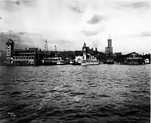 The Grand Trunk Pacific dock stood just north of Colman Dock at the foot of Marion Street. The original dock was built in 1910 as the largest wooden pier on the West Coast. It was not there for long. On July 30, 1914, it was swept away by an explosion and massive fire. The cause has never been determined. Five people died and 29 more were injured. The flames were hot enough to scorch several parts of Colman Dock, but the fire department managed to contain the fire largely to the one pier.[40] A replacement dock was promptly built, and survived until 1964, when it was replaced by waiting area for automobiles boarding ferries at the new ferry terminal.[41]