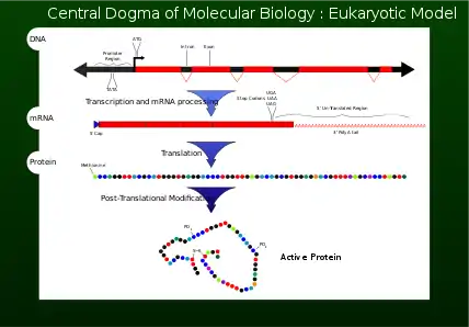 The central dogma of molecular biology is an explanation of the flow of genetic information within a biological system. It is often stated as "DNA makes RNA, and RNA makes protein",[1] although this is not its original meaning. It was first stated by Francis Crick in 1957,[2][3] then published in 1958:[4][5]