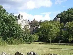 According to tradition, the castle belonged to Waïffe or Waifer, Duke of Aquitaine, and played a role in his war against Pepin the Short. The castle stands on a rock and appears as a collection of irregular buildings, flanked by towers and terraces. A former rampart wall connects the stables to the Gourdon Tower, which was, perhaps, the keep. In front of the entrance is a square building called the guard tower or postern, built in 1585. The Gothic openings have been replaced by large Renaissance windows and the defensive walls have been opened with dormers. A columned gallery circles the outside of the grand salon. An apartment has traces of a painted fresco mural showing the flight of Icarus and the chariot of the sun, the legend of Astyanax and the burning of Troy, and the kidnap of Helen.[1]