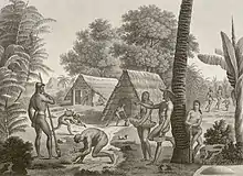 Village scene depicting caste differences, 1819. Apart from the man at the far left, all men and women are depicted as fully nude.