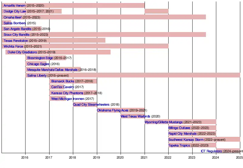 - Wichita Force (Wichita, Kansas) – Joined as an expansion team for the inaugural season of the CIF in 2015. The Force were removed from the league prior to the 2022 season for not meeting league requirements and would join West Texas and Amarillo (who wouldn't end up playing in 2022) in the AFA[42]