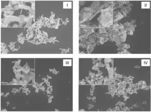 For airborne nanoparticles, techniques for measuring size include cascade impactors, electrical low-pressure impactors, mobility analyzers, and time-of-flight mass spectrometers. For nanoparticles in suspension, techniques include dynamic light scattering, laser diffraction, field flow fractionation, nanoparticle tracking analysis, particle tracking velocimetry, size exclusion chromatography, centrifugal sedimentation, and atomic force microscopy. For dry materials, techniques for measuring size include electron microscopy, atomic force microscopy, and X-ray diffraction. Back-calculation from surface area measurements are commonly employed, but these are subject to error for porous materials.[7] Additional methods include hydrodynamic chromatography, static light scattering, multiangle light scattering, nephelometry, laser-induced breakdown detection, and ultraviolet–visible spectroscopy;[4] as well as near-field scanning optical microscopy, confocal laser scanning microscopy, capillary electrophoresis, ultracentrifugation, cross-flow filtration, small-angle X-ray scattering, and differential mobility analysis.[8] Use of an environmental scanning electron microscope avoids morphological changes caused by the vacuum required for standard scanning electron microscopy, at the cost of resolution.[4][8]