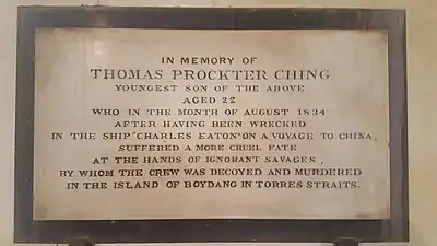 Memorial to Thomas Prockter Ching in St Mary Magdalene's Church, Launceston, Cornwall.
