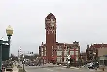 The Warehouse is a three-story rectangular Jacobethan Revival structure built of dark red brick.[6] It was constructed using the Kahn System of reinforced concrete building construction. The prominent clocktower, originally designed as an architectural feature to hold the building's industrial water tower,[7] is one of the most visible landmarks in the city.[6]