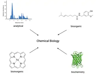 Chemical biology is a scientific discipline between the fields of chemistry and biology. The discipline involves the application of chemical techniques, analysis, and often small molecules produced through synthetic chemistry, to the study and manipulation of biological systems.[1] Although often confused with biochemistry, which studies the chemistry of biomolecules and regulation of biochemical pathways within and between cells, chemical biology remains distinct by focusing on the application of chemical tools to address biological questions.[2]