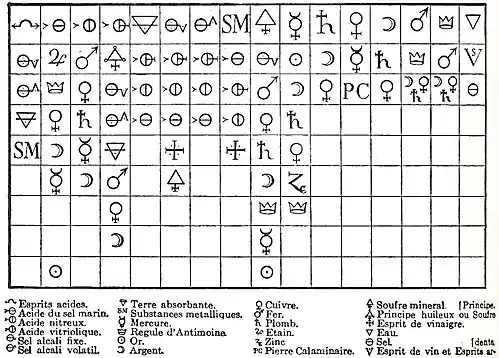 Geoffroy's 1718 Affinity Table: at the head of each column is a chemical species with which all the species below can combine. Some historians have defined this table as being the start of the chemical revolution.[1]