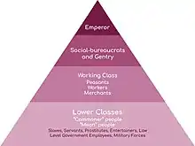 The lower classes of ordinary people were divided into two categories: one of them the good "commoner" people, the other the "mean" people. Slaves, Servants, Prostitutes, Entertainers, Low Level Government Employees and Military Forces were part of the mean class. The soldiers were called a necessary evil, and civilians were placed in command to keep the military from dominating society. Those who worked in entertainment were given a special status that allowed for them to be punished severely without consequence.[42] The mean people were heavily discriminated against, forbidden to take the Imperial Examination, and mean and good people could not marry each other.[43][44][45][46][47]