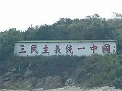 ROC sign in Dadan reading "三民主義統一中國" (Sānmín zhǔyì tǒngyī zhōngguó, tr. "The Three Principles of the People unites China")