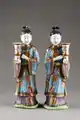 The combination of blue and white colour is one of the most popular colour palette combination in history and originated from Asian ceramics of the 9th century.[41] Chinese blue and white porcelain, which was developed since the Tang dynasty and fully matured in Yuan dynasty, and are one of the most nationalistic arts of China, often appears in modern fashion shows.[42]: 513–514 This colour palette found in ceramics later spread in Europe and influenced the Delftware in the 16th century and Willow pattern created by British manufacturers in the later 18th century; the 18th century was also the era when printed fabrics such as blue and white Toile de Jouy gained popularity and inspired fashion designers to use the blue and white as a prominent colour palette in the coming year.[41] It was thus adopted in fashion designs of garments and shoes of famous fashion designers, such as Christian Dior, Valentino, Dr Martens.[41] Some modern fashion designers, such as Roberto Cavalli, Guo Pei, were also directly inspired by Chinese blue and white porcelain.[41][note 1]