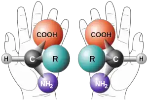In chemistry, chirality usually refers to molecules. Two mirror images of a chiral molecule are called enantiomers or optical isomers. Pairs of enantiomers are often designated as "right-", "left-handed" or, if they have no bias, "achiral". As polarized light passes through a chiral molecule, the plane of polarization, when viewed along the axis toward the source, will be rotated clockwise (to the right) or anticlockwise (to the left). A right handed rotation is dextrorotary (d); that to the left is levorotary (l). The d- and l-isomers are the same compound but are called enantiomers. An equimolar mixture of the two optical isomers, which is called a racemic mixture, will produce no net rotation of polarized light as it passes through.[19] Left handed molecules have l- prefixed to their names; d- is prefixed to right handed molecules. However, this d- and l- notation of distinguishing enantiomers does not say anything about the actual spatial arrangement of the ligands/substituents around the stereogenic center, which is defined as configuration. Another nomenclature system employed to specify configuration is Fischer convention.[20] This is also referred to as the D- and L-system. Here the relative configuration is assigned with reference to D-(+)-Glyceraldehyde and L-(−)-Glyceraldehyde, being taken as standard. Fischer convention is widely used in sugar chemistry and for α-amino acids. Due to the drawbacks of Fischer convention, it is almost entirely replaced by Cahn-Ingold-Prelog convention, also known as the sequence rule or R and S nomenclature.[21][22] This was further extended to assign absolute configuration to cis-trans isomers with the E-Z notation.