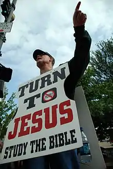 Christian fundamentalism has also been linked to child abuse[81][82][83] and corporal punishment,[84][85][86] with most practitioners believing that the Bible requires them to spank their children.[87][88] Artists have addressed the issues of Christian fundamentalism,[89][90] with one providing a slogan "America's Premier Child Abuse Brand."[91]