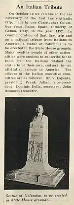5. 1 2 Unknown author (17 June 1919). “Indianapolis Italians to Offer City Monument to Christopher Columbus”. Indianapolis News (Indianapolis).