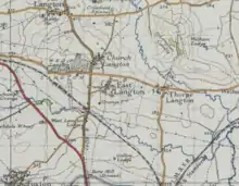 The parish also includes Church Langton. It is near Kibworth and Market Harborough, and the parish according to the 2011 census had a population of 393.[2] Church Langton church tower is a landmark to travellers from the south, and the whole building is finely proportioned.[3] The church has an organ given by William Hanbury, vicar for 25 years from 1753.[4] There is an Old Roman Road that runs nearby, as it moves southeast out of Leicester. It is about 86 miles north of London, 12 miles south-east of Leicester city and 4 miles north of Market Harborough. Overall, the parish covers 1,055 acres of land and includes all of the township of East Langton. Its nearest arterial road is the B6047, with the village lying just to the east.