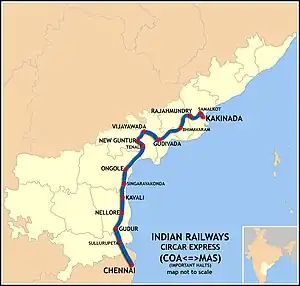 - ↑ "Circar Express/17644 Express Kakinada Port". India Rail Info. 3 March 2011. Retrieved 14 April 2012.