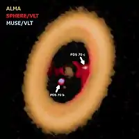 In June 2019 astronomers reported the detection of evidence of a circumplanetary disk around PDS 70b[5] using spectroscopy and accretion signatures. Both types of these signatures were also detected for other planetary candidates before. A later infrared characterization could not confirm the spectroscopic evidence for the disk around PDS 70b and reports weak evidence that the current data favors a model with a single blackbody component.[6] In July 2019 astronomers reported the first-ever detection using the Atacama Large Millimeter/submillimeter Array (ALMA)[7][8][9] of a circumplanetary disk.[7][8][10] ALMA studies, using millimetre and submillimetre wavelengths, are better at observing dust concentrated in interplanetary regions, since stars emit comparatively little light at these wavelengths, and since optical observations are often fraught with overwhelming glare from the bright host star.