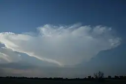 Thunderstorms can form dense cirrus at their tops. As the cumulonimbus cloud in a thunderstorm grows vertically, the liquid water droplets freeze when the air temperature reaches the freezing point.[30] The anvil cloud takes its shape because the temperature inversion at the tropopause prevents the warm, moist air forming the thunderstorm from rising any higher, thus creating the flat top.[31] In the tropics, these thunderstorms occasionally produce copious amounts of cirrus from their anvils.[32] High-altitude winds commonly push this dense mat out into an anvil shape that stretches downwind as much as several kilometers.[31]