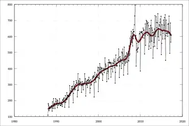 Monthly value of Australian merchandise exports to New Zealand (A$ millions) since 1988