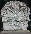 - Elliptical shield with a stylized Sun motif in the middle surrounded by a number of stars. The number can vary either 12 or 16, the latter case representing the 16 Great Turkic Empires,