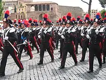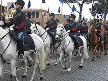The blue cockade was until then placed on the hat of the uniform of the Carabinieri, on the frieze of the Bersaglieri caps and on the headgear of the cavalry regiments.[83][84][85] On the hat of the Carabinieri the blue cockade was present since the foundation of the military branch, which is dated 1814,[86] for the cavalry its introduction is ascribable to 1843[81] while for the Bersaglieri to 1836.[84]