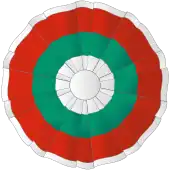 In the case of the Italian tricolour cockade, the green is located in the centre because in the flag of Italy this colour is the one closest to the flagpole.[12] The tricolour cockades with red and green in the opposite position are those of Iran[13] and Suriname.[14] Conversely, the national ornament of Bulgaria and Maldives, starting from the centre, are arranged white, green and red, while that of Madagascar, starting from the centre, is arranged white, red and green.[14]